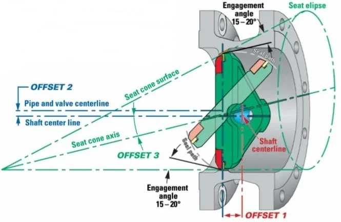 The 3rd Offset is not a shaft position, but a Seat Shape. The seat is machined as a tilted segment of a cone (elliptical profile). This creates a geometry where the sealing components do not touch until the final millimeter of travel.